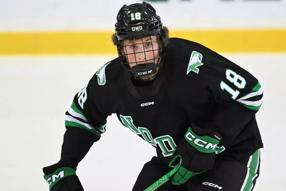 FILE - North Dakota defenseman Keaton Verhoeff skates to the puck against St. Cloud State during an NCAA hockey game, Dec. 6, 2025, in St. Cloud, Minn. (AP Photo/Craig Lassig, File)