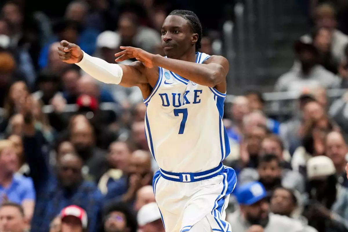 Duke guard Dame Sarr celebrates a basket against UConn during the first half in the Elite Eight of the NCAA college basketball tournament, Sunday, March 29, 2026, in Washington. (AP Photo/Stephanie Scarbrough)