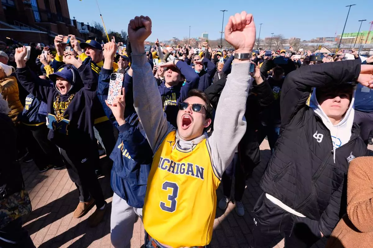 Michigan fans including Nick Weykamp celebrate winning the NCAA basketball tournament championship with the team as they return to campus Tuesday, April 7, 2026, in Ann Arbor, Mich. (AP Photo/Paul Sancya)