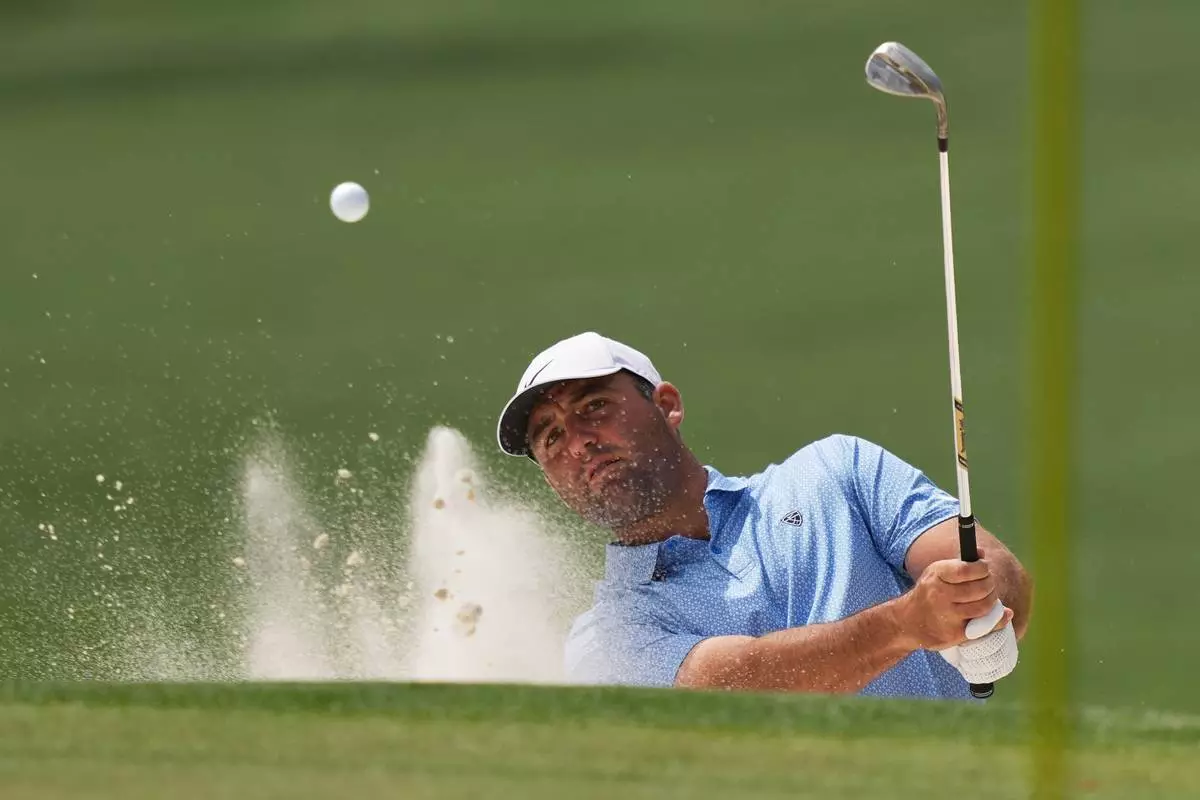 Scottie Scheffler hits from the bunker on the sixth hole during a practice round ahead of the Masters golf tournament at the Augusta National Golf Club, Tuesday, April 7, 2026, in Augusta, Ga. (AP Photo/Matt Slocum)
