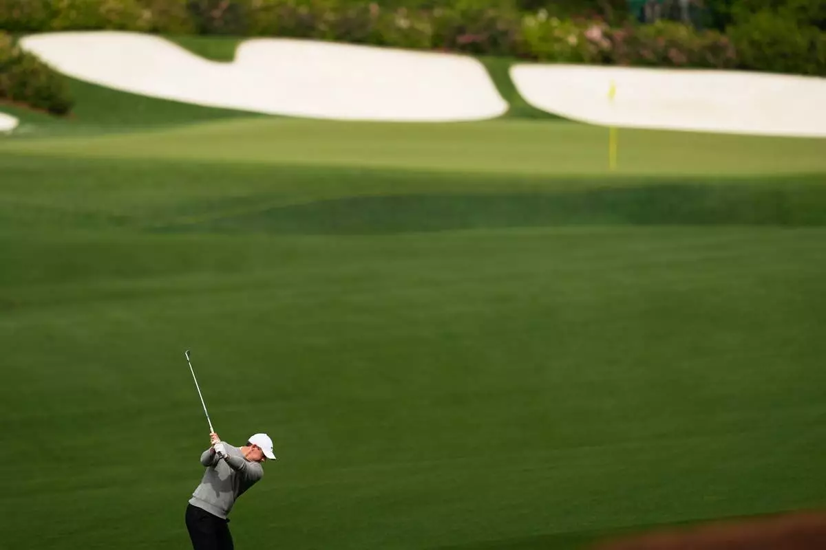 Rory McIlroy, of Northern Ireland, hits from the fairway on the 13th hole during a practice round ahead of the Masters golf tournament at the Augusta National Golf Club, Tuesday, April 7, 2026, in Augusta, Ga. (AP Photo/David J. Phillip)