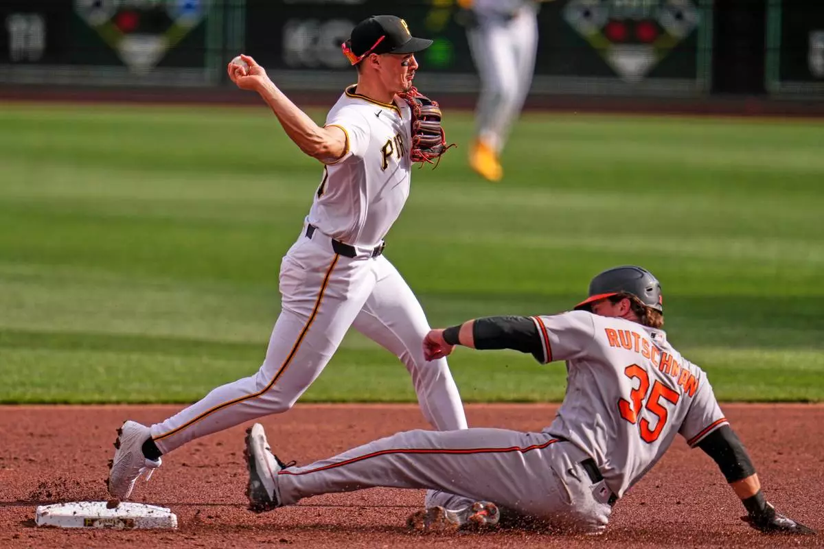 Pittsburgh Pirates shortstop Konnor Griffin gets the force out at second on Baltimore Orioles' Adley Rutschman (35) but fails to complete the double play on Dylan Beavers at first base during the second inning of a baseball game in Pittsburgh, Saturday, April 4, 2026. (AP Photo/Gene J. Puskar)
