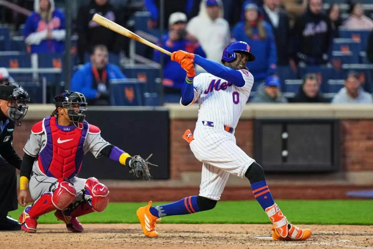 New York Mets' Ronny Mauricio (0) hits a walk-off single during the tenth inning of a baseball game against the Arizona Diamondbacks Tuesday, April 7, 2026, in New York. (AP Photo/Frank Franklin II)