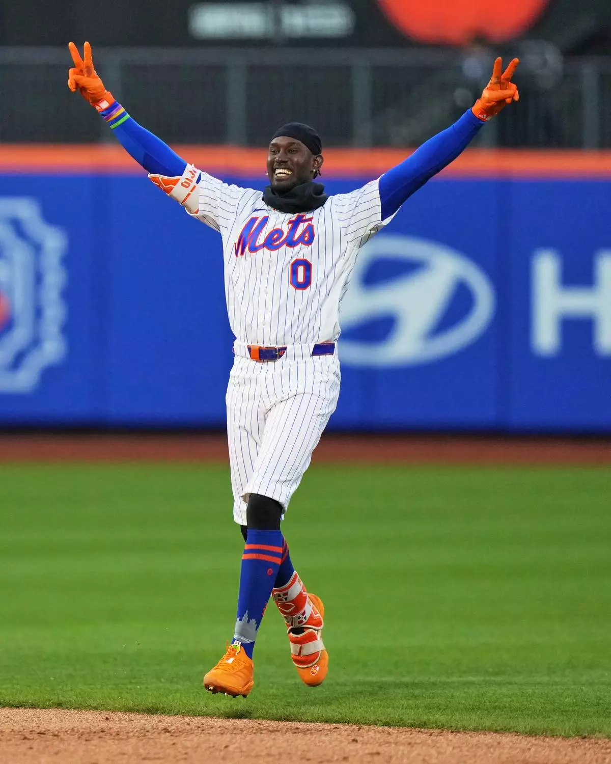 New York Mets' Ronny Mauricio (0) celebrates after hitting a walk-off single during the tenth inning of a baseball game Tuesday, April 7, 2026, in New York. (AP Photo/Frank Franklin II)