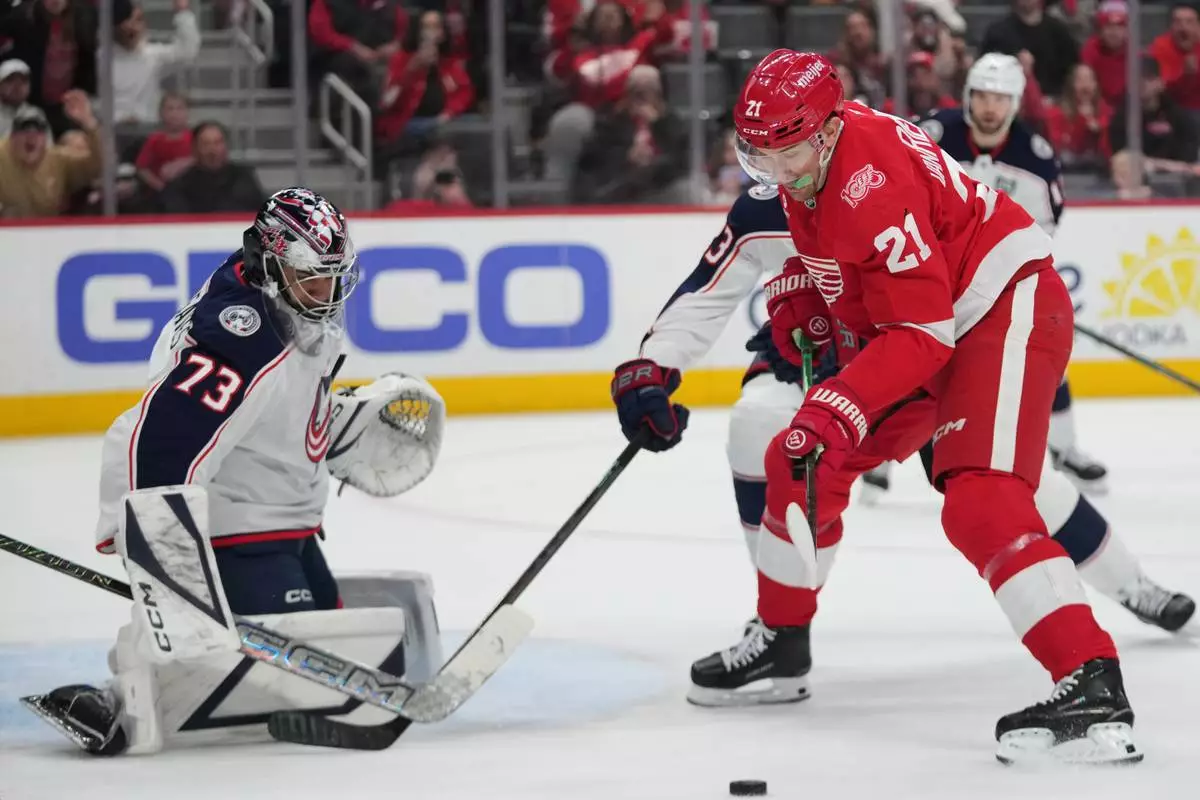 Columbus Blue Jackets goaltender Jet Greaves (73) stops a Detroit Red Wings center Emmitt Finnie (58) shot in the second period of an NHL hockey game Tuesday, April 7, 2026, in Detroit. (AP Photo/Paul Sancya)