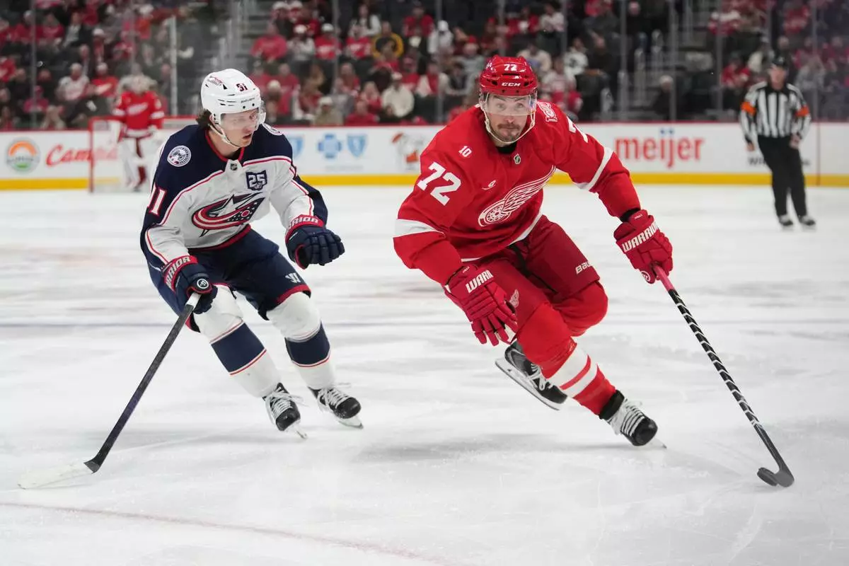 Detroit Red Wings defenseman Justin Faulk (72) protects the puck from Columbus Blue Jackets center Kent Johnson (91) in the second period of an NHL hockey game Tuesday, April 7, 2026, in Detroit. (AP Photo/Paul Sancya)