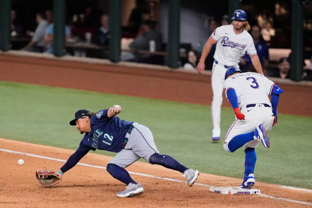 Texas Rangers' Joc Pederson (3) reaches on a single as Seattle Mariners first baseman Josh Naylor (12) dives for an errant throw to the bag in the fifth inning of a baseball game Tuesday, April 7, 2026, in Arlington, Texas. (AP Photo/Tony Gutierrez)