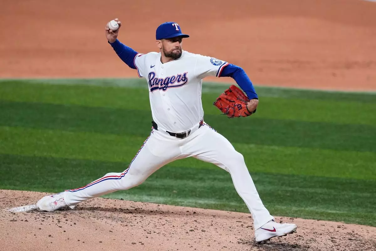 Texas Rangers pitcher Nathan Eovaldi throws to the Seattle Mariners in the fifth inning of a baseball game Tuesday, April 7, 2026, in Arlington, Texas. (AP Photo/Tony Gutierrez)