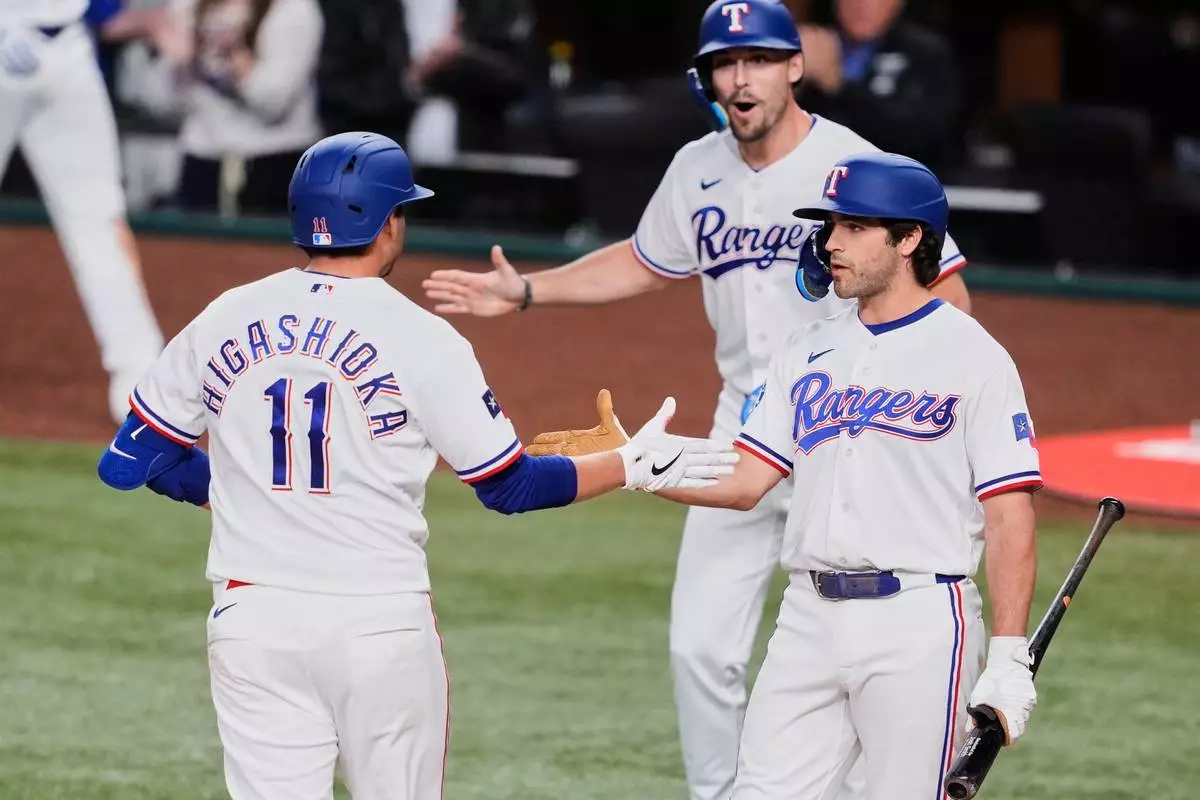 Texas Rangers' Kyle Higashioka (11) celebrates with Josh Smith, right, and Evan Carter, rear, after hitting a two-run home run in the fifth inning of a baseball game against the Seattle Mariners Tuesday, April 7, 2026, in Arlington, Texas. (AP Photo/Tony Gutierrez)