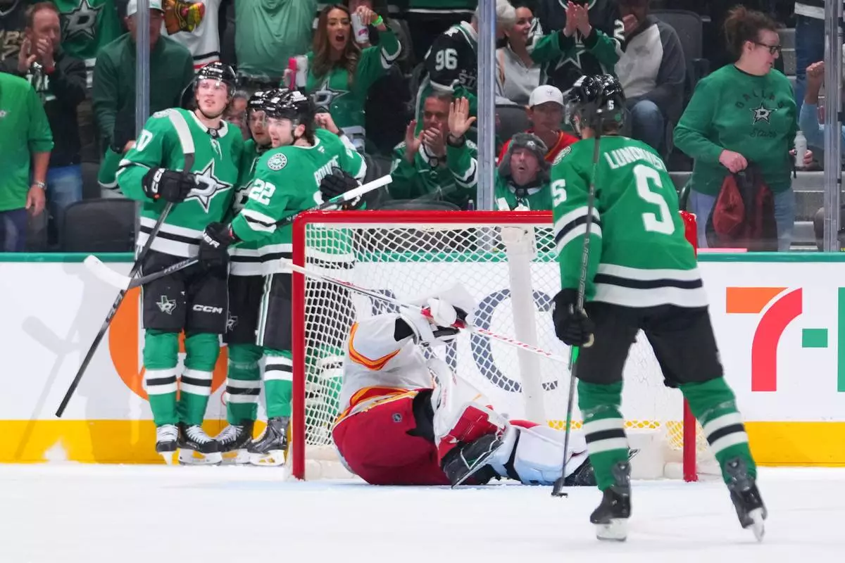 Jake Oettinger stopped 17 shots in the win for the Stars. Devin Cooley made 21 saves for the Flames.