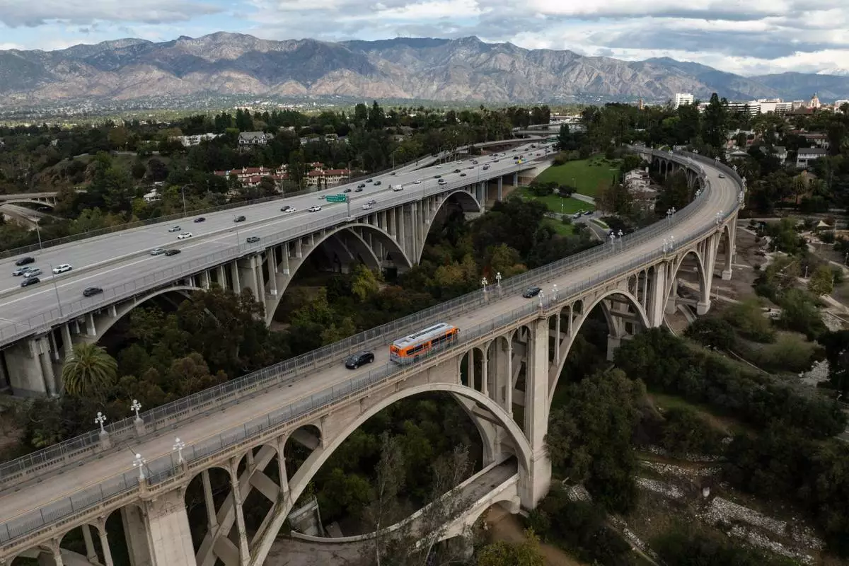 Motorists cross the historic Colorado Street Bridge in the foreground, a Route 66 landmark in Pasadena, Calif., Saturday, Nov. 22, 2025. (AP Photo/Jae C. Hong)
