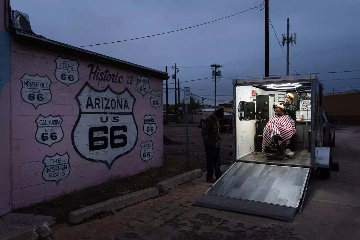Rana Bal gets a haircut from Daniel Bailon inside a mobile barbershop in Holbrook, Ariz., a town on historic Route 66, Wednesday, Nov. 19, 2025. (AP Photo/Jae C. Hong)