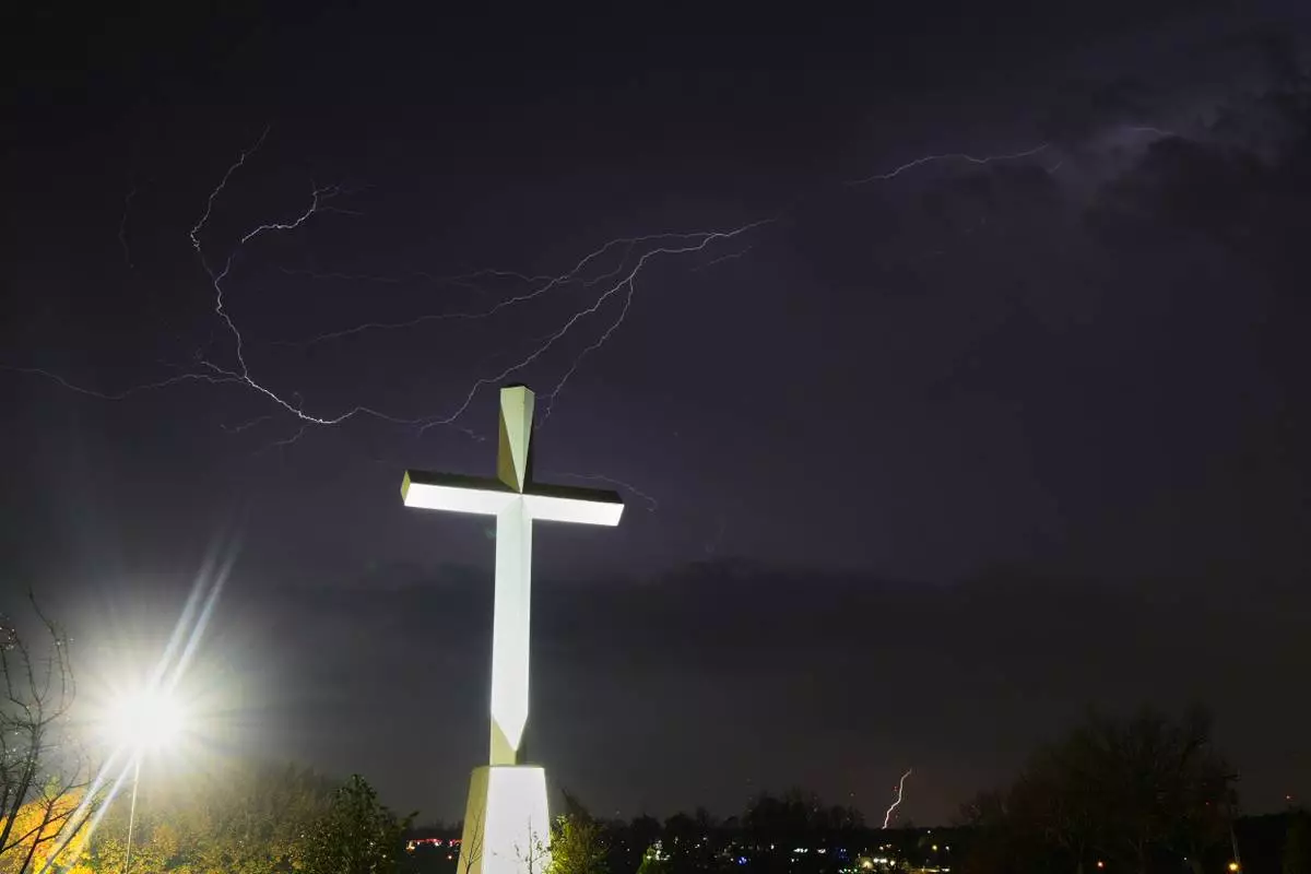 Lightning is visible on the sky near a large cross at the grounds of Life.Church, where Route 66 meets with Interstate-35 in Edmond, Okla, Wednesday, Nov. 19, 2025. (AP Photo/Julio Cortez)