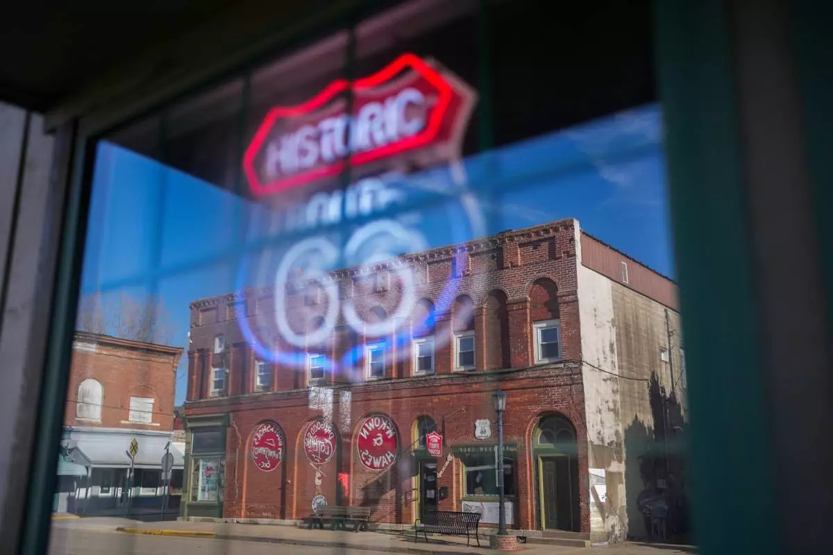 The McKown & Hawes Building is reflected in a window with a neon Route 66 sign in Atlanta, Ill., Wednesday, Jan. 7, 2026. (AP Photo/Erin Hooley)