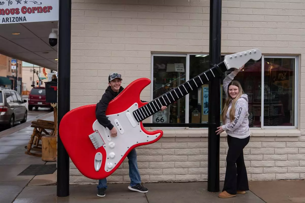 Newlyweds Keith Hedberg, left, and his wife, Adriana, traveling from Syracuse, Kansas, on their honeymoon, pose for photos with a large guitar installation outside a gift shop in Winslow, Ariz., a town on historic Route 66, Thursday, Nov. 20, 2025. (AP Photo/Jae C. Hong)