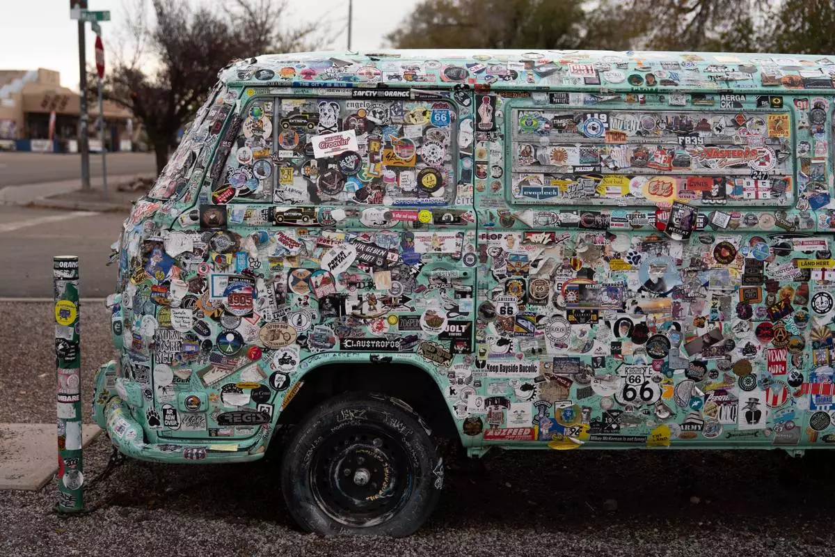 A vehicle covered in stickers is parked outside a souvenir shop in Seligman, Ariz., a town on historic Route 66, Friday, Nov. 21, 2025. (AP Photo/Jae C. Hong)
