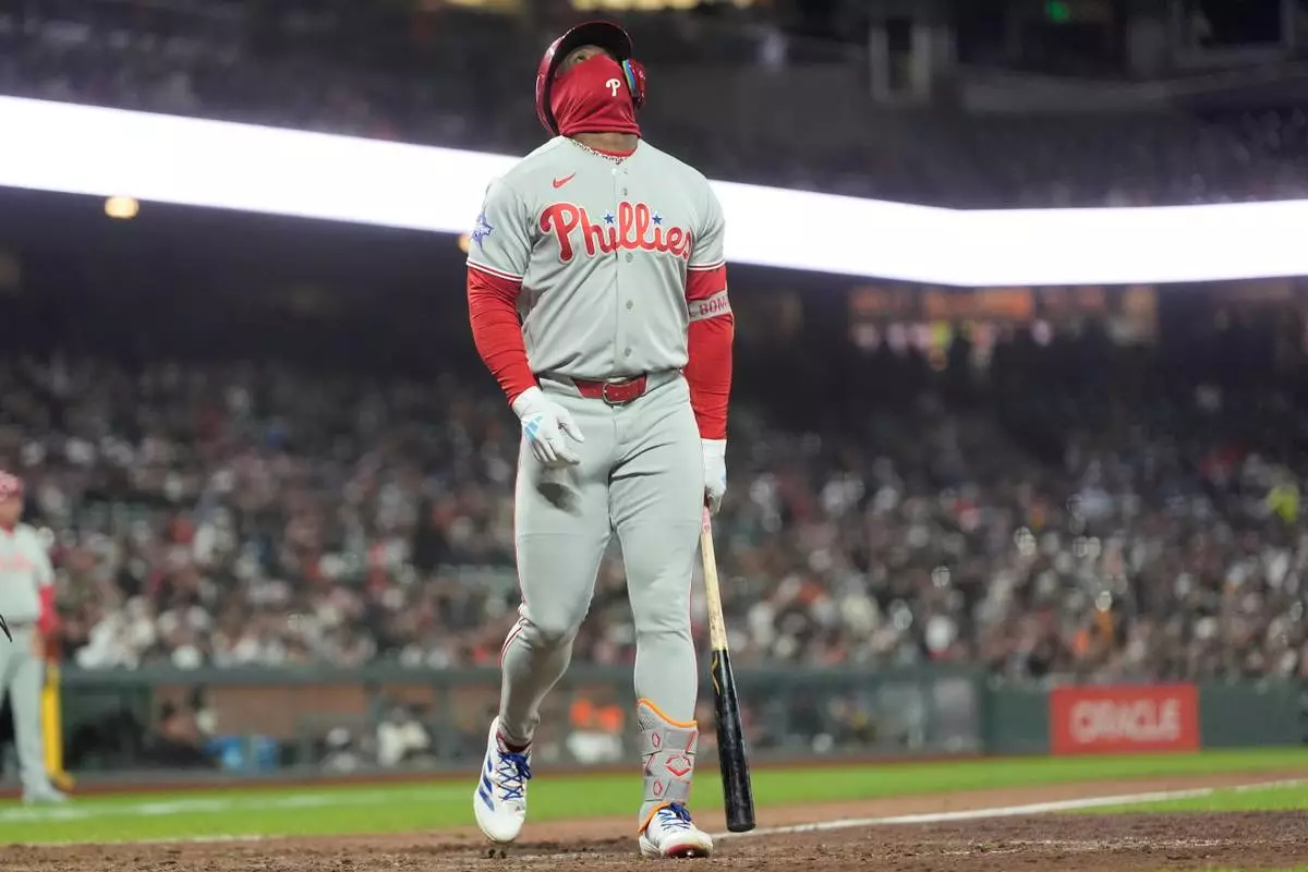 Philadelphia Phillies' Adolis García reacts after striking out against the San Francisco Giants during the eighth inning of a baseball game in San Francisco, Tuesday, April 7, 2026. (AP Photo/Jeff Chiu)