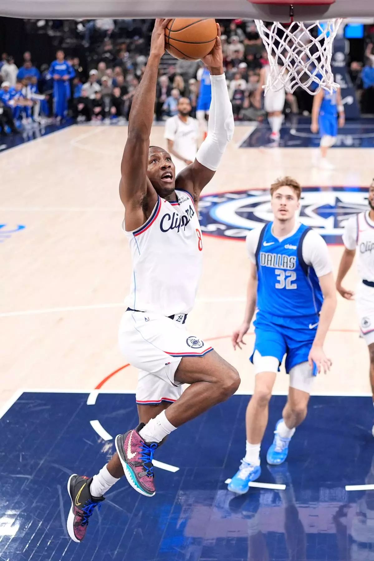 Los Angeles Clippers guard Kris Dunn, left, dunks as Dallas Mavericks forward Cooper Flagg watches during the first half of an NBA basketball game Tuesday, April 7, 2026, in Inglewood, Calif. (AP Photo/Mark J. Terrill)