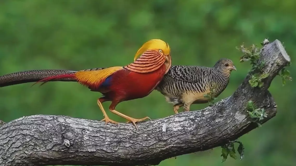 Spring is the breeding season for golden pheasants. The male was seen to fluff its gorgeous tail feathers, strut proudly, and circle with melodious calls to attract the female, putting on a lively and romantic courtship display.