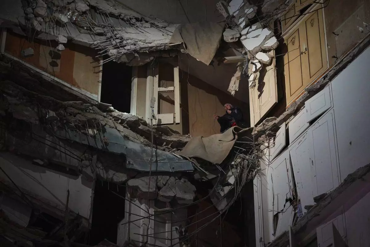 A woman stands at a destroyed apartment on a building that was hit in an Israeli airstrike in central Beirut, Lebanon, Wednesday, April 8, 2026. (AP Photo/Emilio Morenatti)