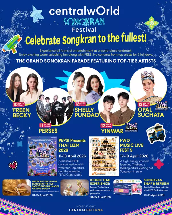The excitement continues with the key highlight, "PEPSI Presents THAI LIZM 2026," from April 11–13, transforming the centralwOrld Square into a Summer Beach Club in the heart of the city. Infused with modern Thai pop culture, the event creates a one-of-a-kind "Songkran beach party experience" featuring over 100 artists, including JOEY BOY, TaitosmitH, PROXIE, PERSES, BNK48, and F.HERO. Spanning four experience zones—concert stage, water play zone, chill-out area, and the thrilling PEPSI Giant Slider soaring over 12 meters high—the festival delivers non-stop energy across three full days.