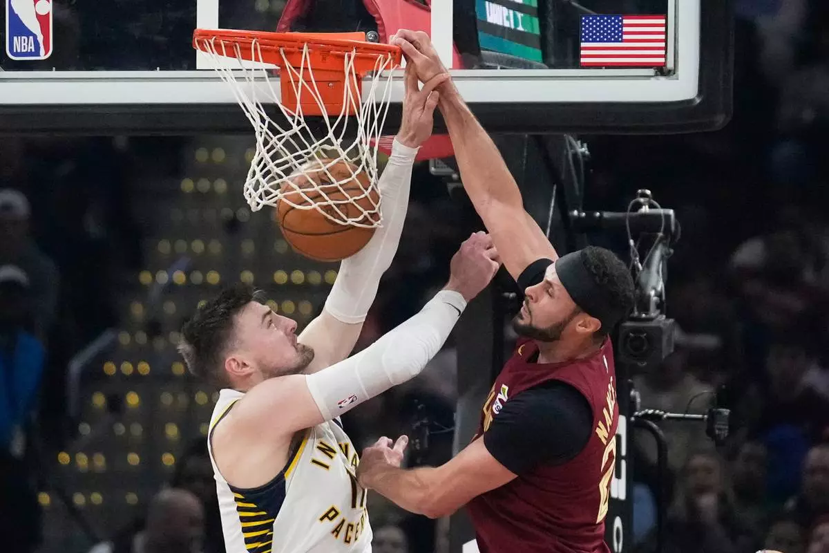 Cleveland Cavaliers forward Larry Nance Jr. (22) dunks ober Indiana Pacers center Micah Potter, left, in the first half of an NBA basketball game in Cleveland, Sunday, April 5, 2026. (AP Photo/Sue Ogrocki)