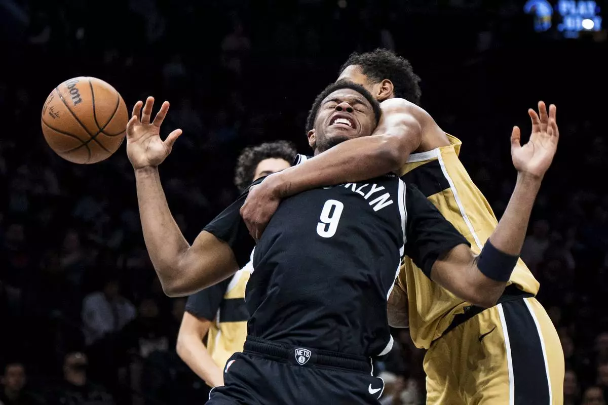 Brooklyn Nets forward E.J. Liddell (9) is fouled by Washington Wizards forward Julian "Juju" Reese (15) during the first half of an NBA basketball game, Sunday, April 5, 2026, in New York. (AP Photo/Angelina Katsanis)