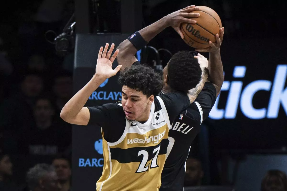 Washington Wizards guard Will Riley (27) gets his arm stuck with Brooklyn Nets forward E.J. Liddell (9) during the second half of an NBA basketball game, Sunday, April 5, 2026, in New York. (AP Photo/Angelina Katsanis)