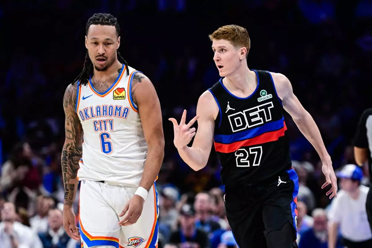 Detroit Pistons guard/forward Kevin Huerter (27) celebrates against Oklahoma City Thunder forward Jaylin Williams (6) during the second half of an NBA basketball game Monday, March. 30, 2026, in Oklahoma City. (AP Photo/Gerald Leong)
