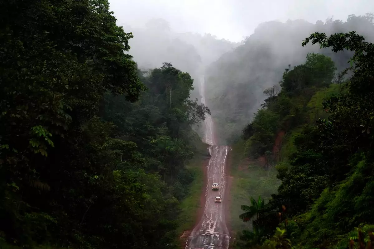 Vehicles move on an unpaved part of the BR-156 highway that connects the state capital Macapa with the city of Oiapoque, Amapa state, Brazil, Friday, March 13, 2026. (AP Photo/Eraldo Peres)