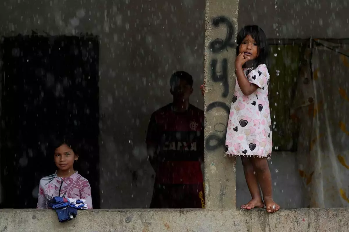 Children watch from the balcony of their house in an area known as Nova Conquista or New Conquest where families are building houses near the center of Oiapoque, Amapa state, Brazil, Tuesday, March 10, 2026. (AP Photo/Eraldo Peres)