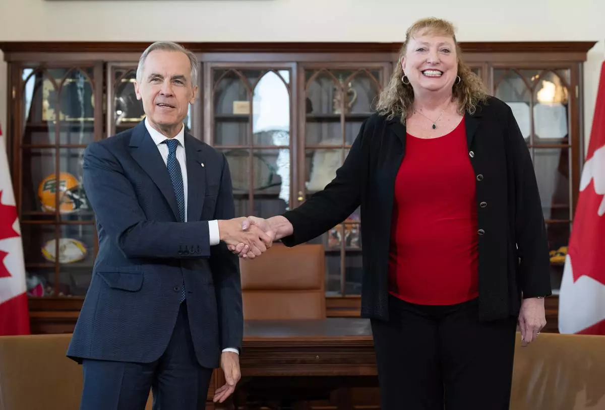 Prime Minister Mark Carney shakes hands with MP for Sarnia-Lambton-Bkejwanong Marilyn Gladu in Ottawa, Wednesday, April 8, 2026. (Adrian Wyld /The Canadian Press via AP)