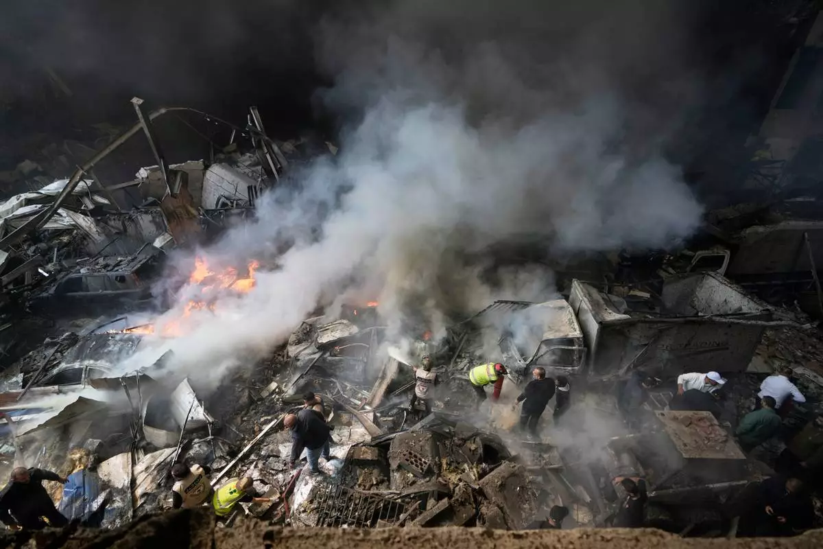 First responders search at the site of an Israeli airstrike that struck an apartment building in Beirut, Lebanon, Wednesday, April 8, 2026. (AP Photo/Bilal Hussein)