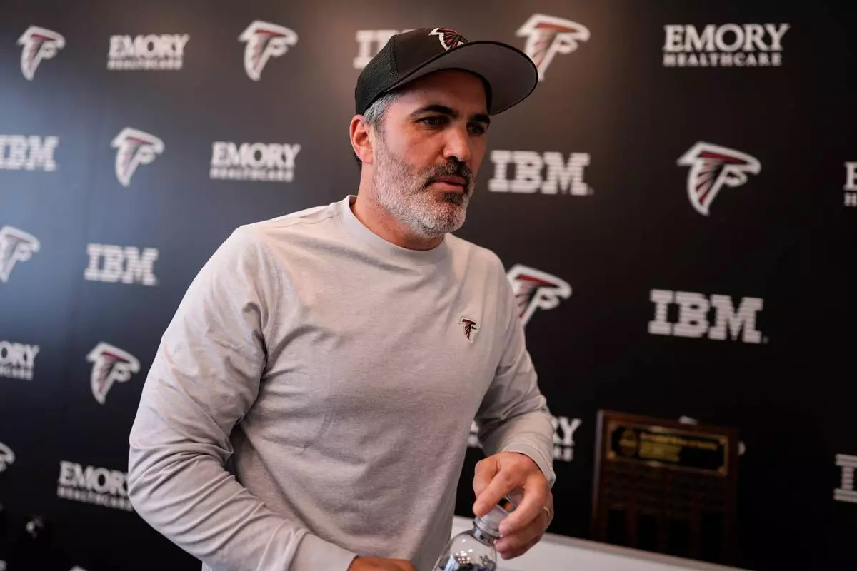 Head Coach Kevin Stefanski leaves after speaking during an Atlanta Falcons NFL media availability, Wednesday, April 8, 2026, in Flowery Branch, Ga. (AP Photo/Mike Stewart)