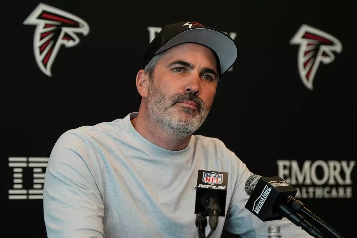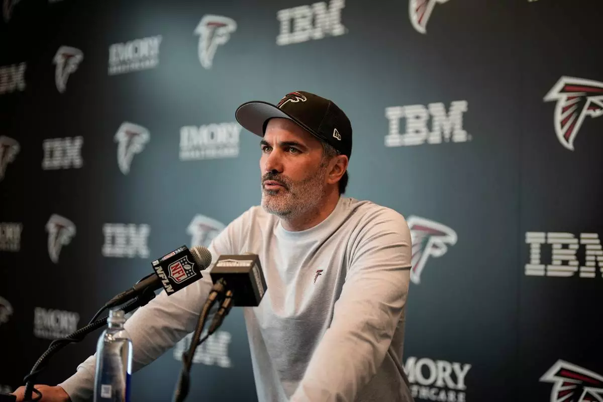 Head Coach Kevin Stefanski speaks during an Atlanta Falcons NFL media availability, Wednesday, April 8, 2026, in Flowery Branch, Ga. (AP Photo/Mike Stewart)