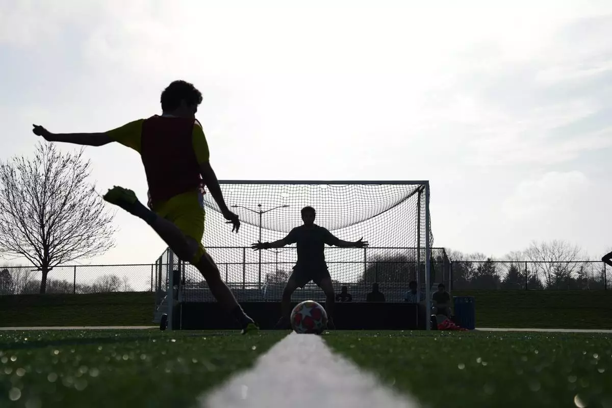 Tehran native and Stony Brook University graduate student Arad Ershad plays soccer with friends at Stony Brook University in Stony Brook, N.Y., Friday, April 3, 2026. (AP Photo/Ryan Murphy)