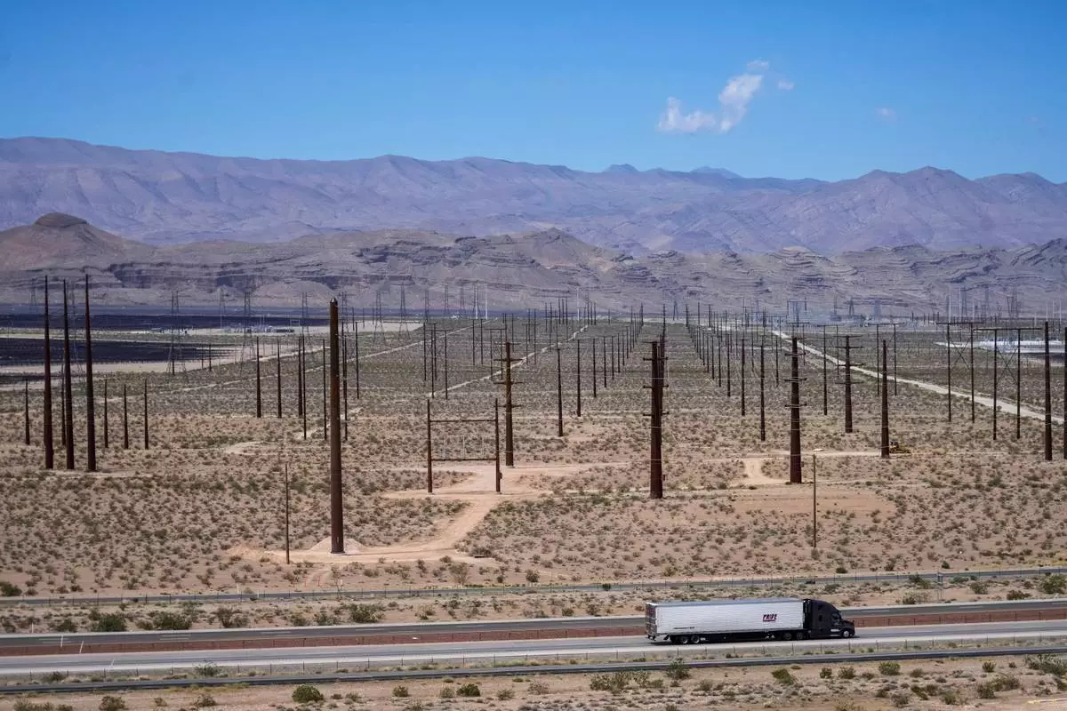 A truck is driven past electrical infrastructure, Thursday, April 2, 2026, in North Las Vegas. (AP Photo/Ty ONeil)