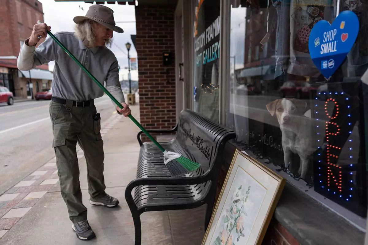 Philip Moulton sweeps the bench outside his Ravenswood Arts gallery where his dog JoJo peers through window, Friday, March 13, 2026, in Ravenswood W.Va., where surging electricity costs have forced some stores out of business. (AP Photo/Carolyn Kaster)