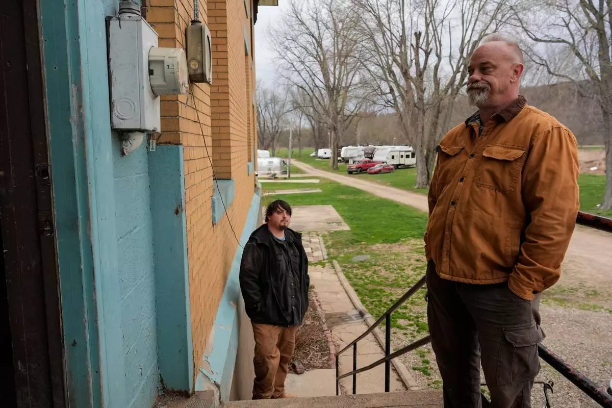 Eric Pinson, right, manager and resident of the Lock 24 RV Park and Campground, is joined by tenant John White Jr., as he looks at an electric meter on the campground in Racine, Ohio, Friday, March 13, 2026. (AP Photo/Carolyn Kaster)