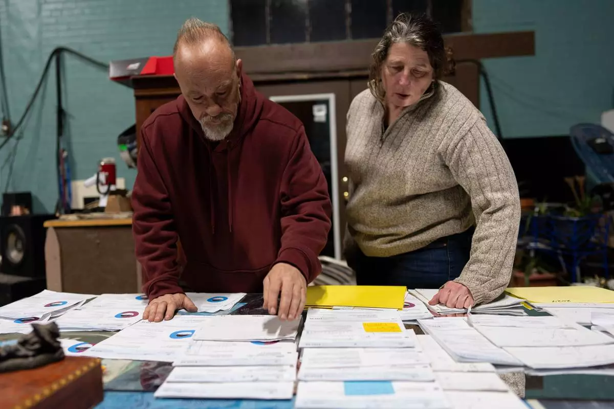 Lock 24 RV Park and Campground manager Eric Pinson, left, and Kirsten Haas pore over the campground's electric bills, at their home at the campground in Racine, Ohio, Friday, March 13, 2026. (AP Photo/Carolyn Kaster)