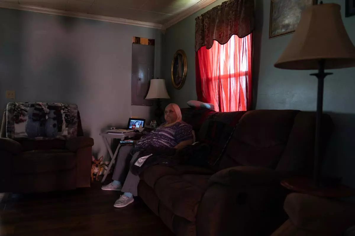 Rebecca Michalski, who recently took out a loan to pay her electric bills, sits with her Chihuahua named Enos in the dark in her home in Rainelle, W.Va., Saturday, March 21, 2026. (AP Photo/Carolyn Kaster)