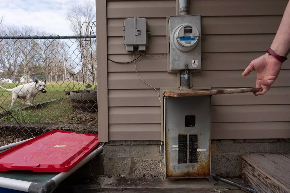 Ashley Nicole Dixon shows her electrical panel below the electric meter as one of her rescued dogs, Lola, holds a toy, at her home in Danese, W.Va., Saturday, March 21, 2026. (AP Photo/Carolyn Kaster)