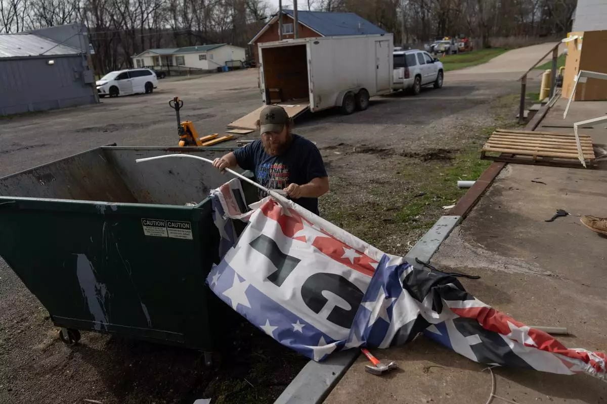 David Horne removes the "Welcome" banner from its pole to put in the dumpster as he works to close up one of the two JCD Bargain and Trade stores, which will consolidate into one location in Ravenswood, W.Va., Friday, March 13, 2026. (AP Photo/Carolyn Kaster)