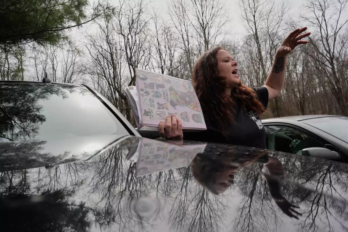 Ashley Nicole Dixon, clutching a binder with the records of pit bulls she has rescued, talks about her rising electric bills outside her home in Danese, W.Va., Saturday, March 21, 2026. (AP Photo/Carolyn Kaster)