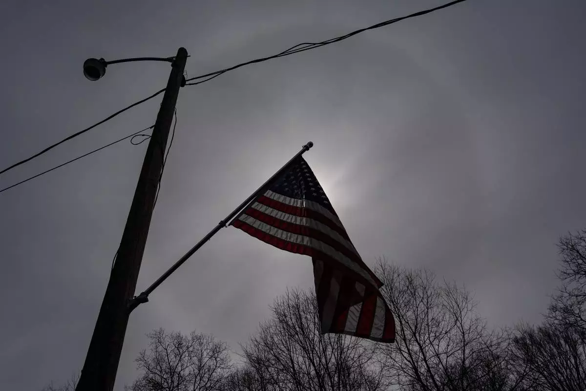 A U.S. flag decorates an electric pole outside Ashley Nicole Dixon's home in Danese, W.Va., Saturday, March 21, 2026. (AP Photo/Carolyn Kaster)