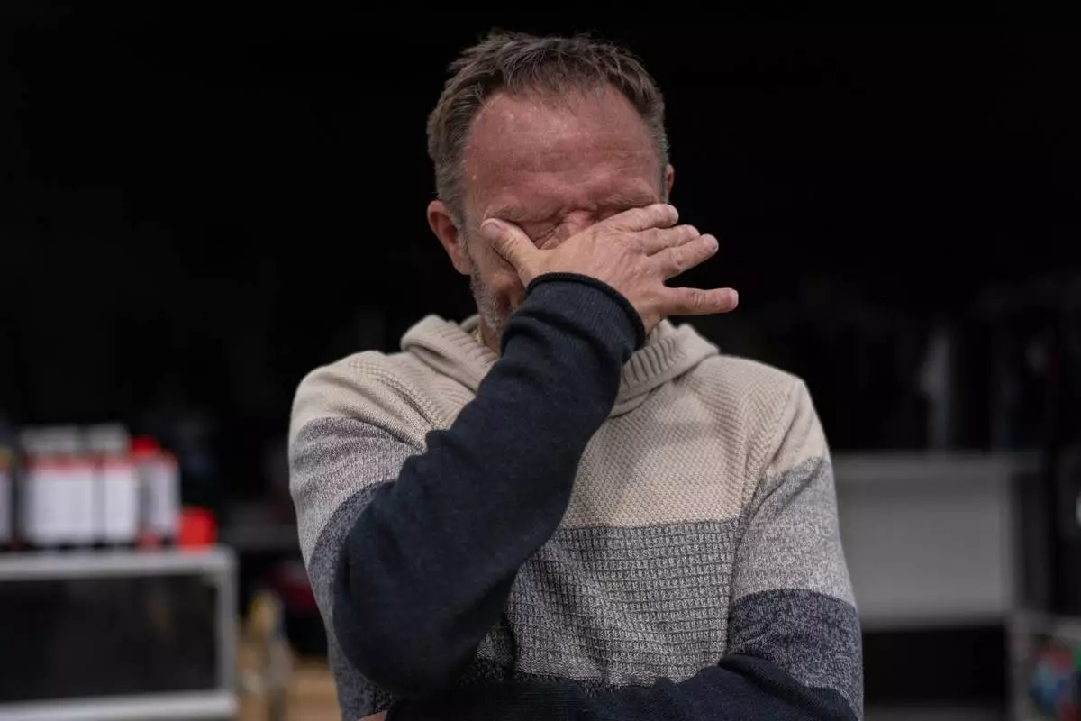 Anthony Crihfield Jones wipes tears outside his JCD Bargain and Trade store near Ripley, W.Va., Friday, March 13, 2026, as he closed his other nearby location to consolidate his businesses under one roof due to high electric bills. (AP Photo/Carolyn Kaster)