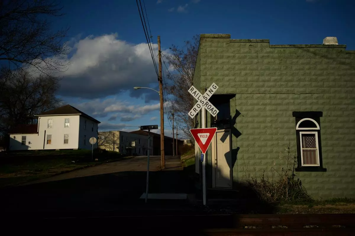 A railroad crossing is seen in the evening light, Thursday, March 12, 2026, in Ravenswood, W.Va., where some shop owners were forced to shut down during winter because they couldn't pay their electric bills. (AP Photo/Carolyn Kaster)