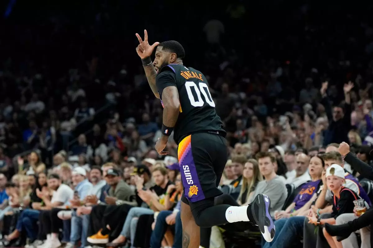 Phoenix Suns forward Royce O'Neale celebrates his 3-pointer against the Dallas Mavericks during the first half of an NBA basketball game, Wednesday, April 8, 2026, in Phoenix. (AP Photo/Ross D. Franklin)