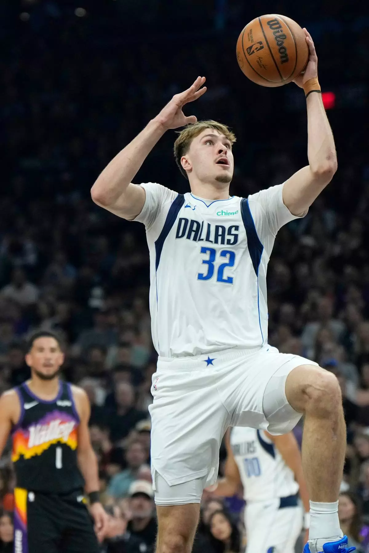 Dallas Mavericks forward Cooper Flagg (32) drives to the basket to score as Phoenix Suns guard Devin Booker (1) looks on during the first half of an NBA basketball game, Wednesday, April 8, 2026, in Phoenix. (AP Photo/Ross D. Franklin)