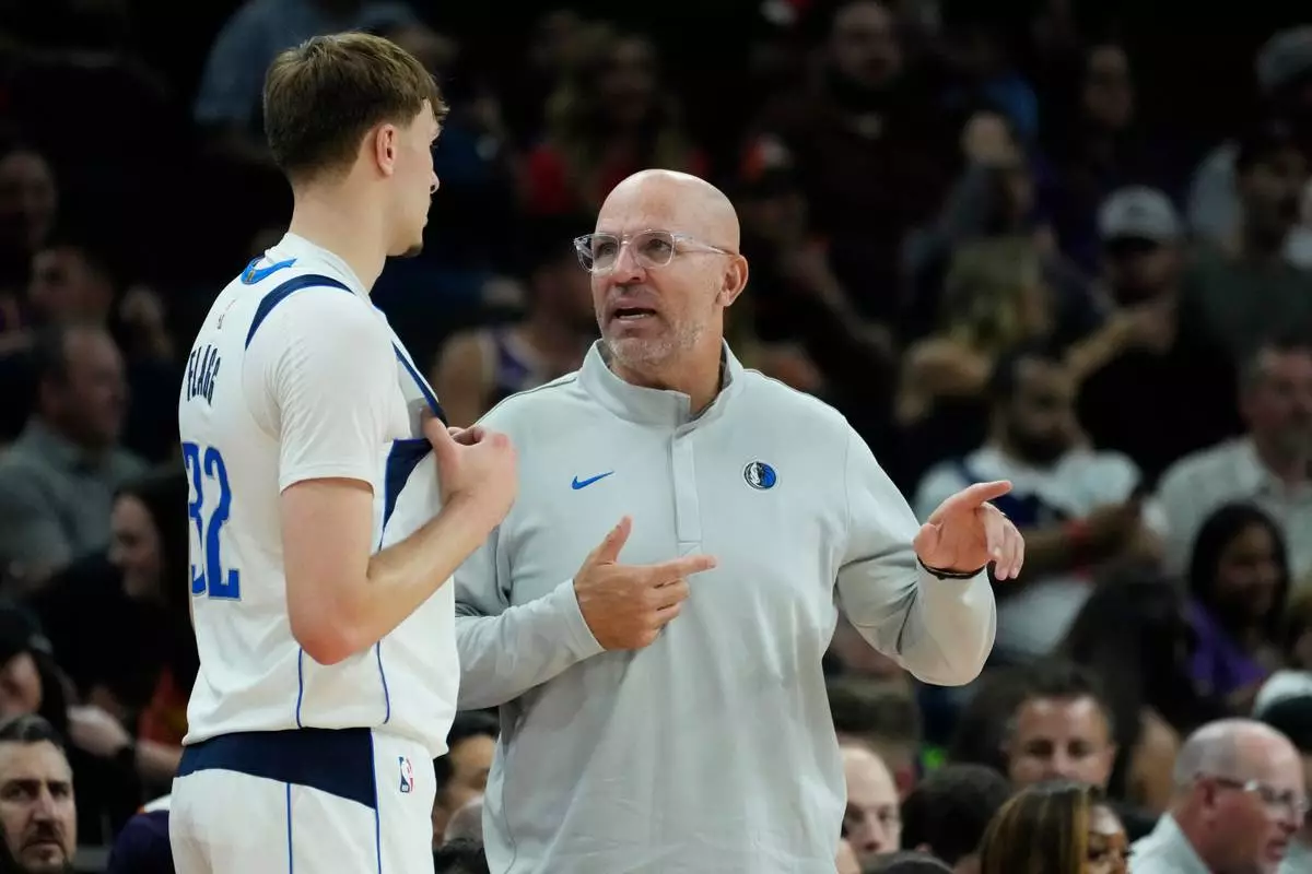 Dallas Mavericks head coach Jason Kidd, right, talks with Mavericks forward Cooper Flagg (32) during the first half of an NBA basketball game against the Phoenix Suns, Wednesday, April 8, 2026, in Phoenix. (AP Photo/Ross D. Franklin)